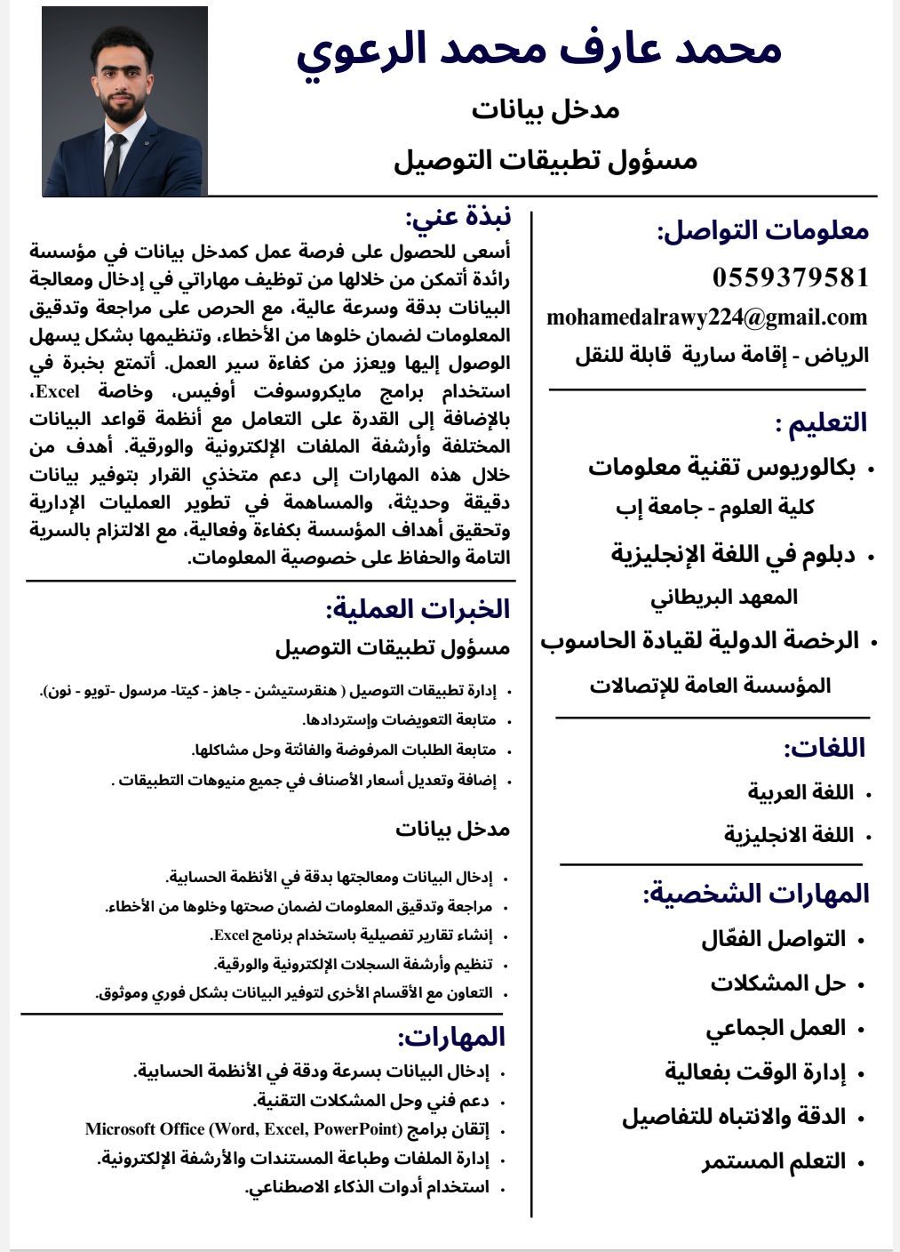 ابحث عن فرصة عمل ك مدخل بيانات أو مسؤول تطبيقات التوصيل. لدي خبرة في إدارة منصات هنقرستيشن، جاهز، كيتا، مرسول، تويوا، نون من حيث تحديث المنيو، ضبط الأسعار، متابعة الطلبات المرفوضة والفائتة، وحل المشاكل اليومية. كما امتلك خبرة في متابعة التعويضات واستردادها والتواصل مع دعم التطبيقات بشكل مستمر. أتميز بالدقة، السرعة، والقدرة على تنظيم البيانات واعداد تقارير مختصرة
