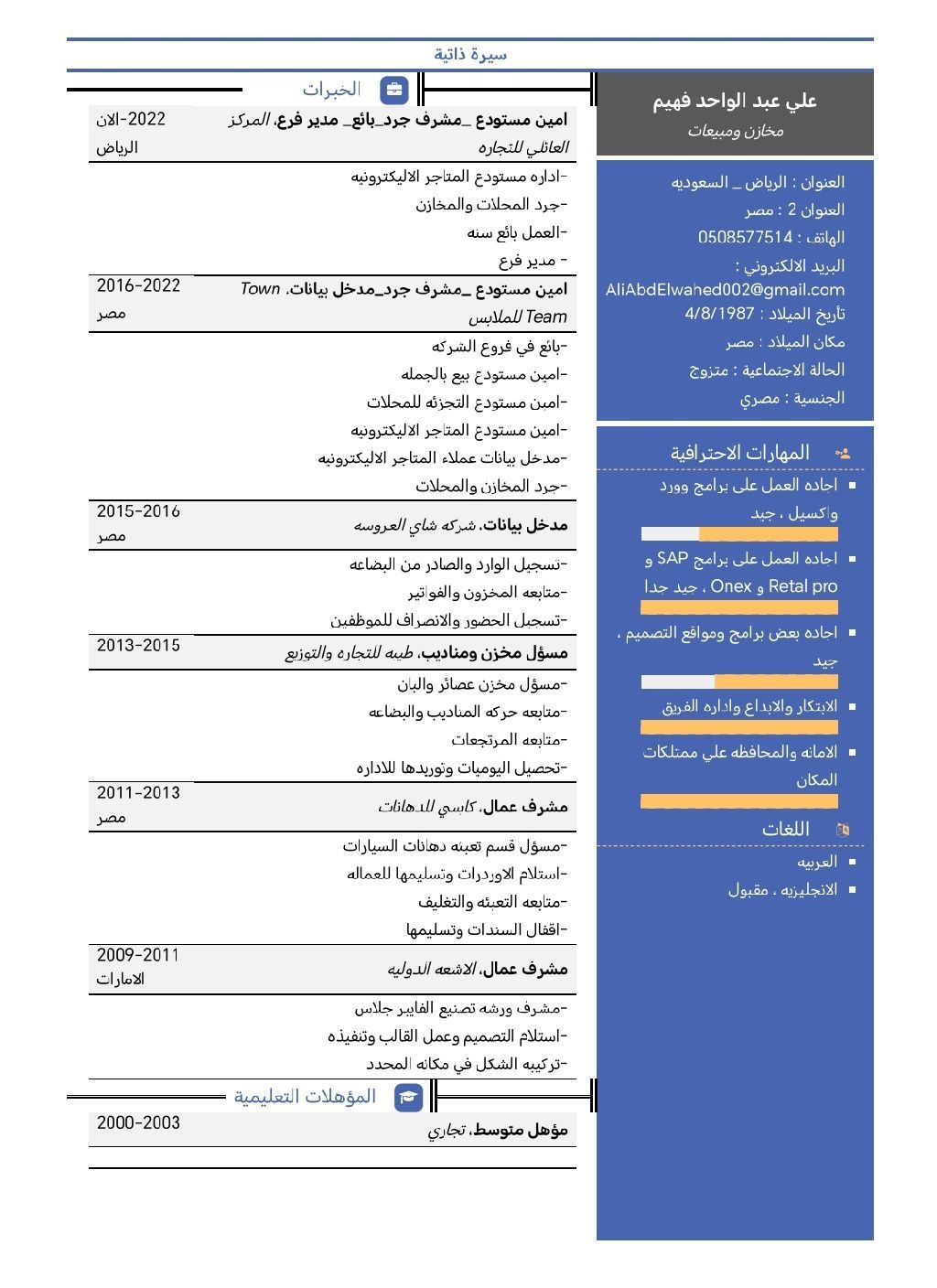 Warehouse and sales supervisor with 12 years of experience in the field, ready for sponsorship transfer and valid residency. General computer skills, including warehouse, sales, and cashier software