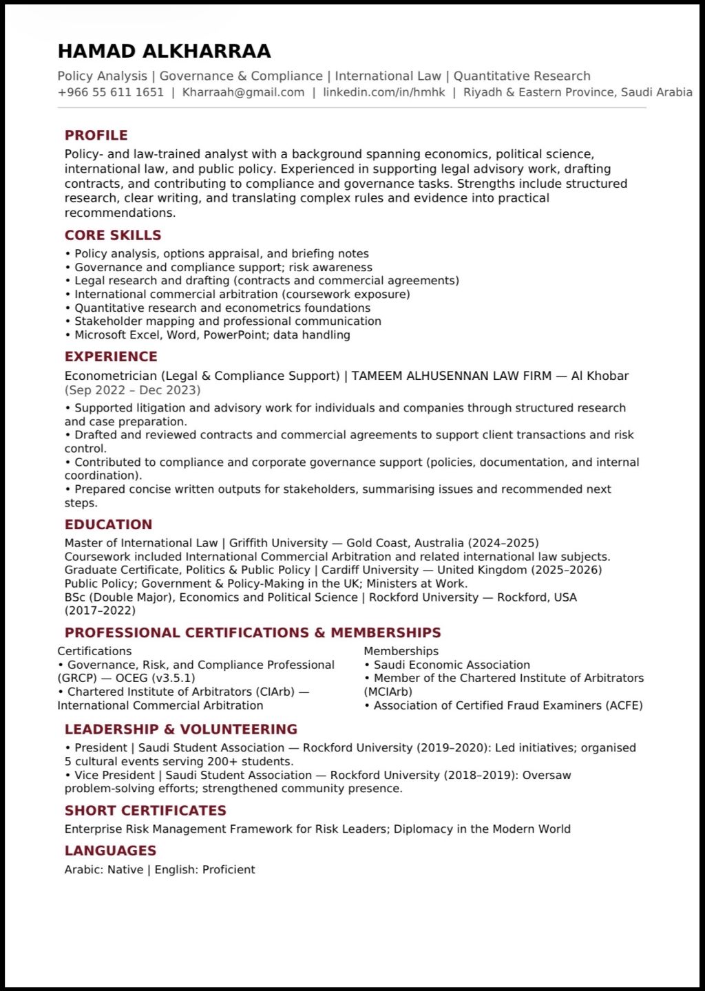 A recent graduate specializing in foreign affairs and international relations, including agreements and partnerships with foreign companies. I have excellent English proficiency, a bachelor degree in Economics and Political Science, and a master’s degree in International Law. I bring strong persuasion skills, the ability to build trust and professional relationships, effective communication