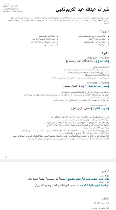 Name Abdullah Khalid, Age 20, Nationality Yemeni, Residence Riyadh. I am looking for a suitable job opportunity. I studied computer science and have experience working in molasses shops. I am able to handle work pressure, am punctual, and have excellent customer service skills. I am seeking a job where I can give my best and develop my skills. May God grant me success. Contact)