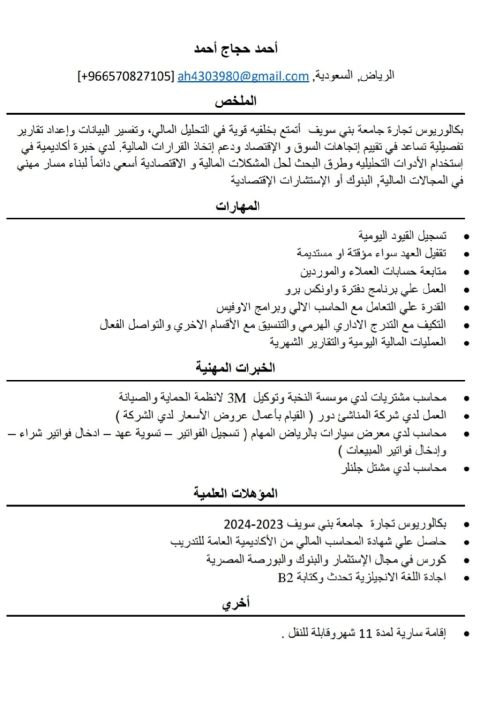 محاسب حديث التخرج، سنة خبرة بالمملكة العربية السعودية، اجادة اللغة الانجليزية تحدث وكتابة، اجادة برامج الأوفيس، وبرامج ERP، دفترة - أونكس برو، القيود اليومية والعمل على فواتير مبيعات ومشتريات ومتابعة كشوف الموردين والعملاء، مراقبة المخزون، تصفية العهد، بالاضافة لشيت المرتبات، متفرغ للعمل، إقامة سارية 11 شهر متاحة للنقل