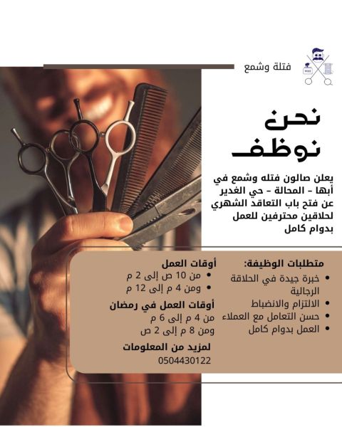 اعلان شاغر مطلوب حلاق مصري الجنسية لديه خبرة كافية في الحلاقة والا ستايل للعمل في أبها بقية تفاصيل العرض الوظيفي تتم عند التواصل