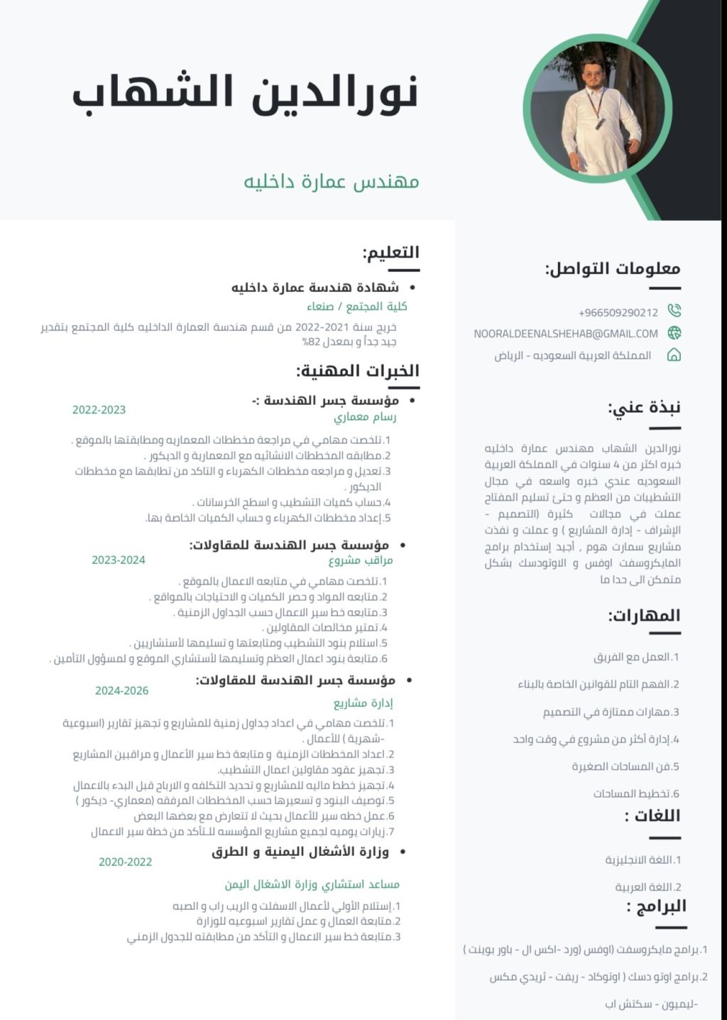 مهندس عمارة داخلية خبرة أكثر من 4 سنوات في مجال التطيبات وادارة المشاريع. عملت في كثير من المجالات (رسم - متابعه جودة - مكتب فني - اشراف مواقع - ادارة مشاريع) ولدي الخبرة الكافيه للعمل على البرامج الهنديه (أوتو كاد - 3 دي مكس - ريفت - لوميون) والبرامج المساعده مايكروسوفت اوفس. عملت في مشاريع عدة مشاريع منها (فلل خاصه - مجمع فلل - عمارات سكنيه طرق) مقيم بالمملكة العربية السعودية