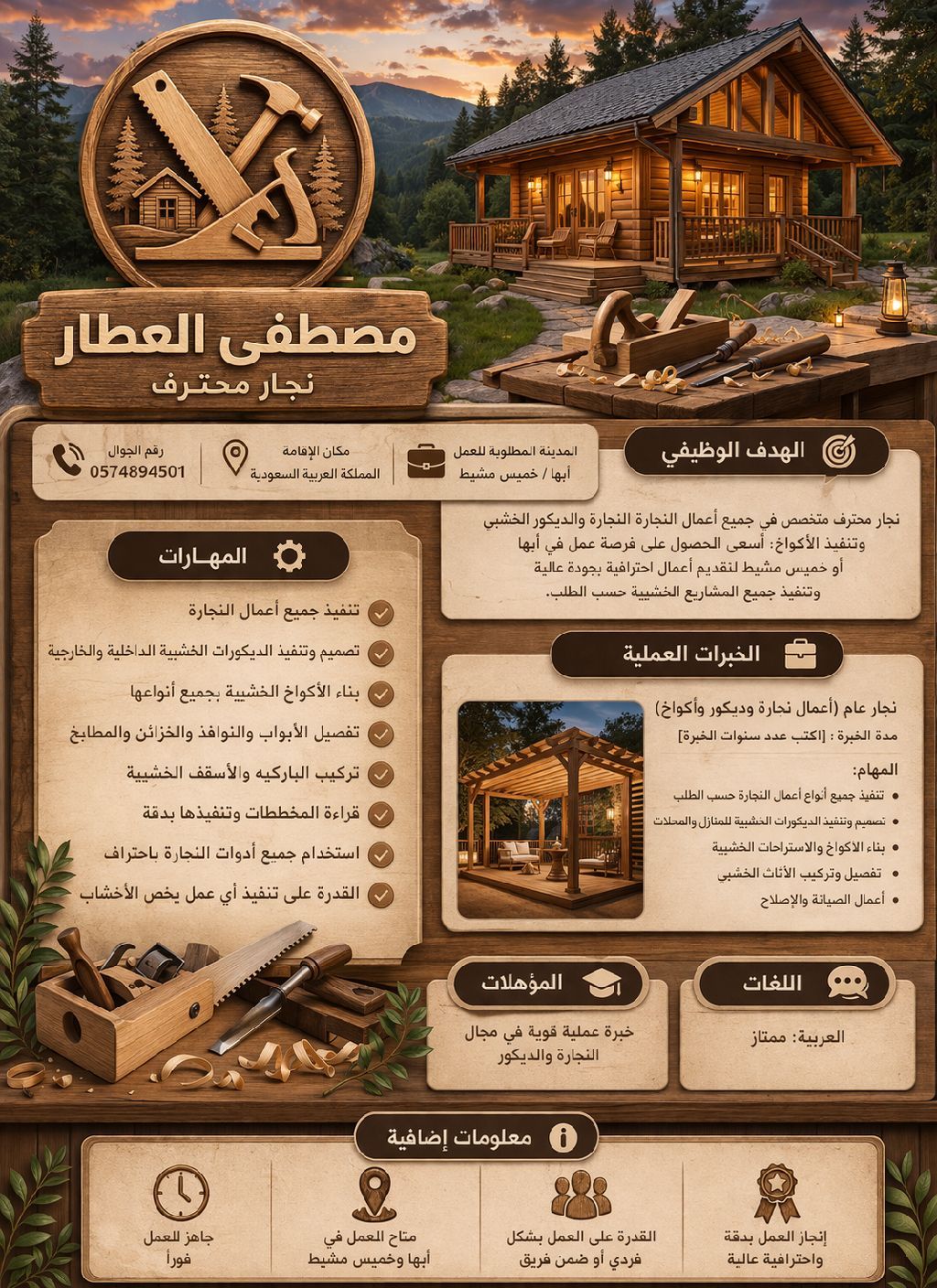 السيرة الذاتية (CV) الاسم مصطفى العطار مكان الإقامة المملكة العربية السعودية المدينة المطلوبة للعمل أبها / خميس مشيط - الهدف الوظيفي نجار محترف متخصص في جميع أعمال النجارة والديكور الخشبي وتنفيذ الأكواخ، أسعى للحصول على فرصة عمل في أبها أو خميس مشيط لتقديم أعمال احترافية بجودة عالية وتنفيذ جميع المشاريع الخشبية حسب الطلب. المهارات - تنفيذ جميع أعمال النجارة