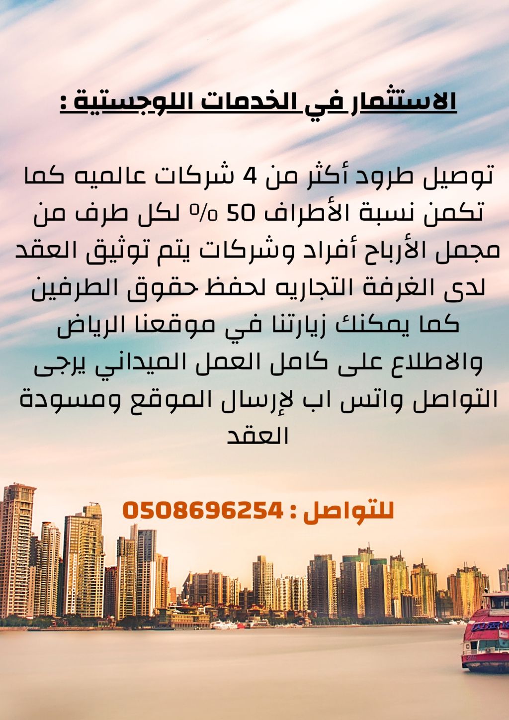 توصيل طرود أكثر من 4 شركات عالمية كما تكمن نسبة الأطراف 50% لكل طرف من مجمل الأرباح أفراد وشركات يتم توثيق العقد لدى الغرفة التجارية لحفظ حقوق الطرفين كما يمكنك زيارتنا في موقعنا الرياض والاطلاع على كامل العمل الميداني يرجى لارسال الموقع ومسودة العقد