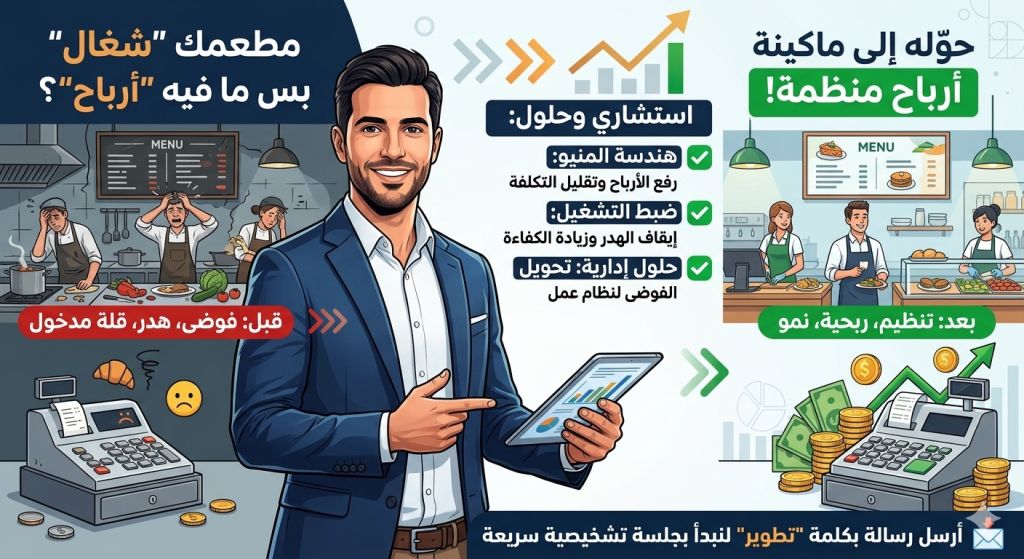 مطعمك يستهلكك. ولا يربحك الزحمة لا تعني دائما الأرباح. اذا كان الدخل قليلا والمنيو مشتتا والإدارة فوضوية، فأنت تحتاج الى نظام وليس مجرد موظفين. أنا هنا لأحول مشروعك الى "استثمار ذكي" منيو هندسي لرفع صافي الربح. تشغيل منضبط لايقاف هدر الموارد. نتائج ملموسة زيادة في المداخيل من الشهر الأول. أرسل "مشكلتك" في رسالة خاصة، وسأقوم بتقييم نقاط الضعف في مطعمك أو المقهى الخاص بك
