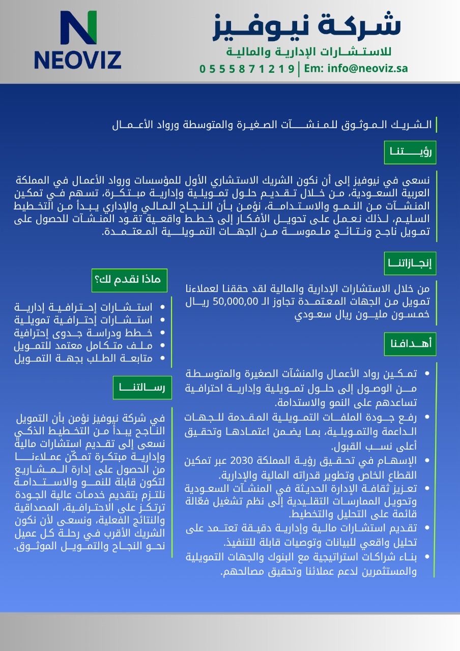 نحن شركة نيوفيز، للاستشارات الادارية والمالية، نقوم بتقديم خدمات الاستشارات وتقديم الحلول المناسبة لحصول المنشأة على تمويل من الجهات المعتمدة - موقعنا الرياض - يرجى التواصل