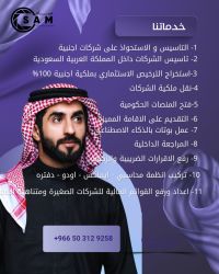 We provide comprehensive business and financial services for investors and business owners in Saudi Arabia Company formation inside Saudi Arabia - 100% foreign ownership investment licensing - Company ownership transfer - Government platforms registration and setup - Tax and Zakat return preparation & filing - Financial statements preparation - Accounting system implementation (Odoo, Daftra, Empax)