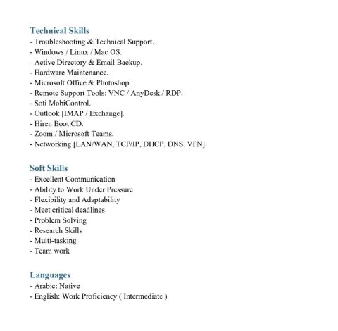 Seeking a Technical Support/ Customer Service position in Saudi Arabia With 1 year experience in information systems available to start immediately I have strong communication, problem - solving, and teamwork skills, and am proficient in Microsoft Office and other software (English level B1) All necessary information is included in my CV contact me to send it to