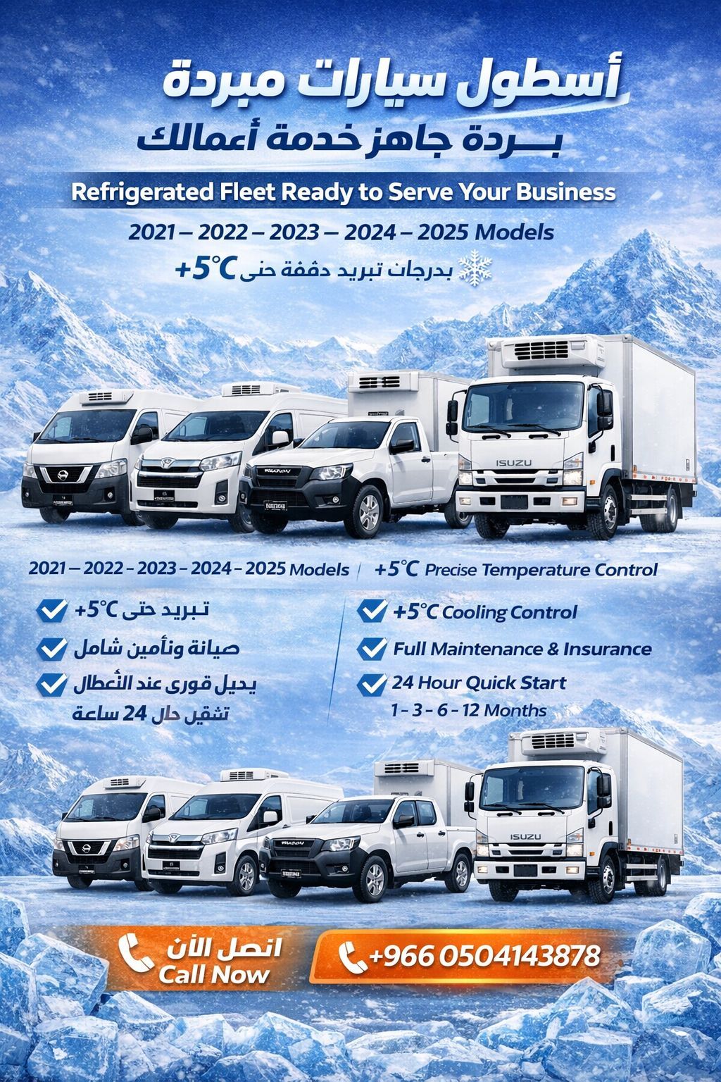 أسطول سيارات مبردة جاهز لخدمة أعمالك في شركة ألفا للنقل والتخزين نقدم حلول نقل مبرد موثوقة بدرجات حرارة دقيقة تصل الى + 5C لضمان سلامة منتجاتك مميزات الخدمة تبريد ثابت ومراقب حتى + 5C صيانة وتأمين شامل جاهزية تشغيل فورية عقود مرنة (شهر - 3 - 6 - 12 شهر) مناسب لنقل المواد الغذائية الادوية المنتجات الحساسة حلول مناسبة لجميع الأعمال سواء كنت شركة توزيع أو مطاعم أو قطاع طبي نوفر لك المركبة المناسبة