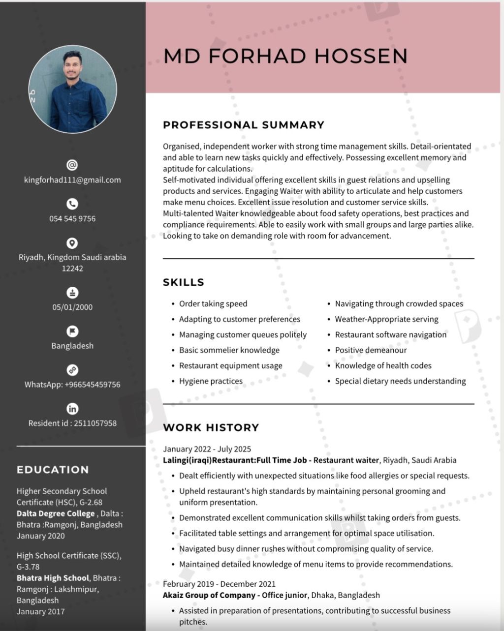 I need a job. I have been working as a waiter in a restaurant in Riyadh, Saudi Arabia for 5 years. I am interested in working in photocopy shops, residential hotels, office work, restaurants, supermarkets, etc. I know the language well. If you need such people, you can contact me. I have a 3 - year Baldia card. I am interested in any job