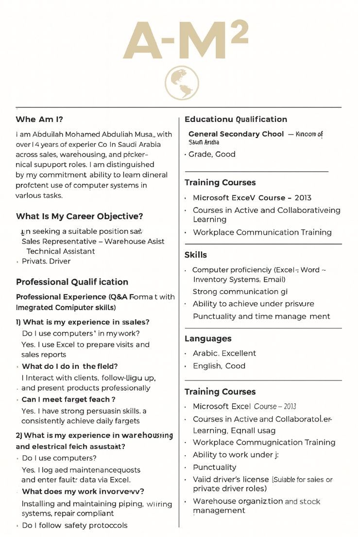 My name is Abdullah Mohammed Abdullah Mousa, and I am actively seeking a suitable job opportunity in Riyadh