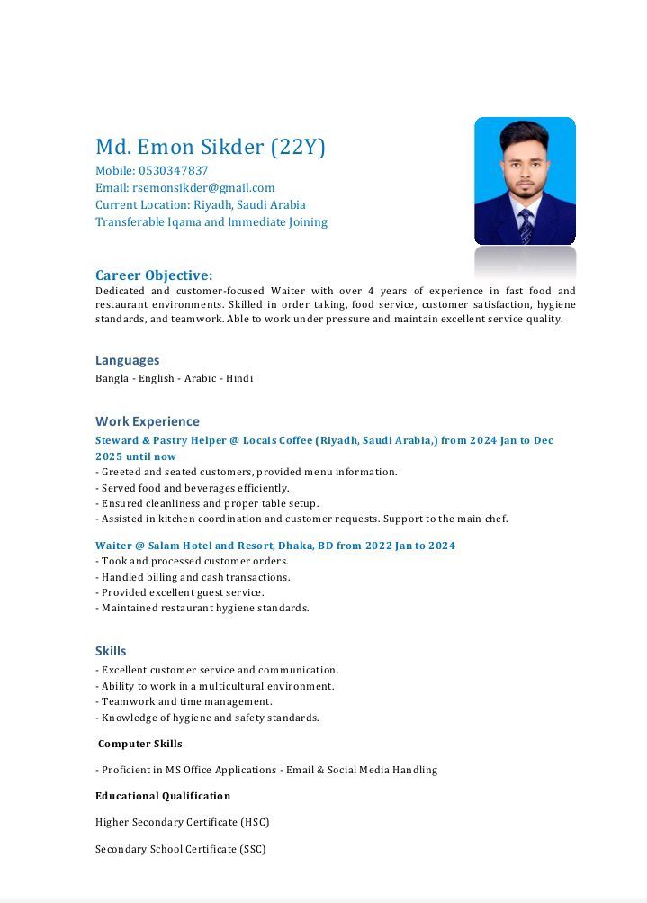 I have experience in cleaning works and pastry helper. Before I work as a pastry helper and used to do all kind of works as a cleaner. But I dont have job right now so I am looking for a job very urgently. My all kinds of description are given in my CV so I am looking for your attention and waiting for an Interview to get a job. Thanks for your attention