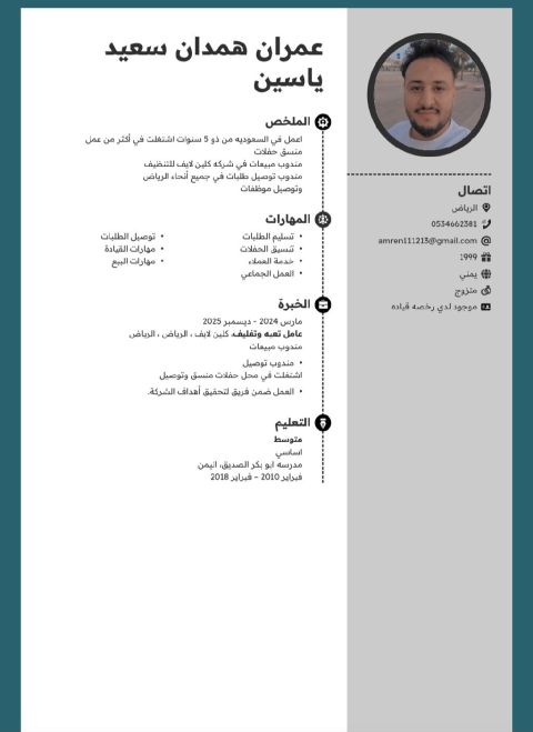 ابحث عن عمل. اعمل كنادل في مطعم في الرياض، المملكة العربية السعودية، منذ خمس سنوات. أرغب بالعمل في محلات التصوير، الفنادق، المكاتب، المطاعم، محلات السوبر ماركت، وغيرها. أجيد اللغة. اذا كنتم بحاجة الى شخص مثلي، يمكنكم التواصل معي. لدي بطاقة بلدية سارية المفعول لمدة ثلاث سنوات. أنا مهتم بأي وظيفة. رقم