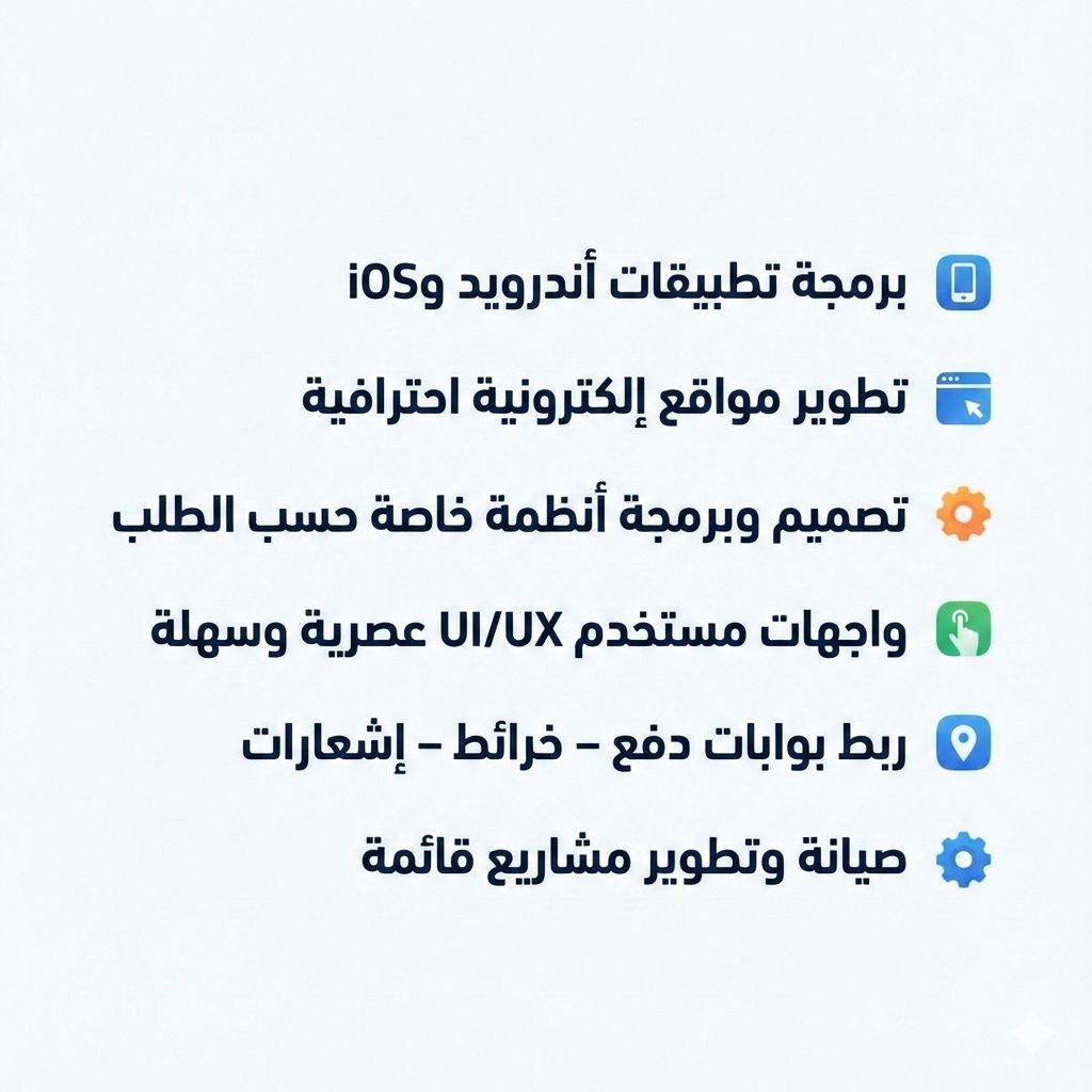 برمجة تطبيقات ومواقع - حلول تقنية متكاملة مطور برمجيات أقدم خدمات برمجة وتطوير التطبيقات والمواقع الالكترونية باحترافية عالية وبأسعار مناسبة الخدمات المقدمة برمجة تطبيقات اندرويد وiOS تطوير مواقع الكترونية احترافية - تصميم وبرمجة أنظمة خاصة حسب الطلب - واجهات مستخدم UI / UX عصرية وسهلة - ربط بوابات دفع - خرائط - اشعارات - صيانة وتطوير مشاريع قائمة