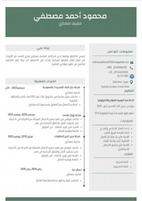 أنا مشرف عمال عندي خبرة بالمقاولات مدة أربعه سنين خبرة في التأسيس والتشطيب ومتابعه سير العمل والعمال حاصل علي رخصة قيادة سارية وإقامة سارية حاصل علي دبلوم علوم كمبيوتر