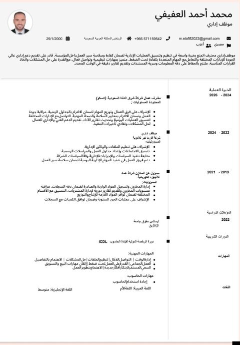 ابحث عن وظيفة مشرف عمال أنا محمد العفيفي، حاصل على ليسانس حقوق، العمر 26 عاما، متواجد في الرياض المملكة العربية السعودية منذ عام ونصف. عملت في مكتب خدمات عامة لمدة ستة أشهر، كما عملت مشرفا في شركة مقاولات لمدة عام. متواجد في الرياض ومستعد للعمل في أي مكان داخل المملكة العربية السعودية، وابحث عن فرصة عمل في وظيفة ادارية أو وظيفة مشرف. مرفق السيرة الذاتية للاطلاع، وجاهز للتواصل في حال توفر فرصة
