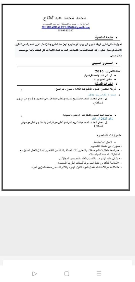 محمد عبد الفتاح مصري الجنسية 30 سنة حاصل ع ليسانس أداب قسم نظم المعلومات الجغرافية ابحث عن عمل مشرف أو مراقب أ اداري مقيم في جدة