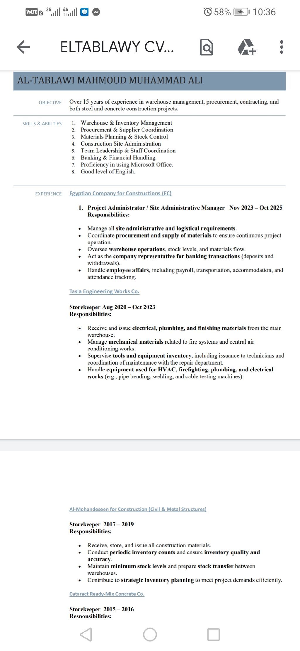 خبرة لأكثر من 15 عاما في مجال المخازن وادارتها والمقاولات والمشتريات والإنشاءات المعدنية والخرسانة، مصري الجنسية، ابحث عن عمل، مقيم في الرياض