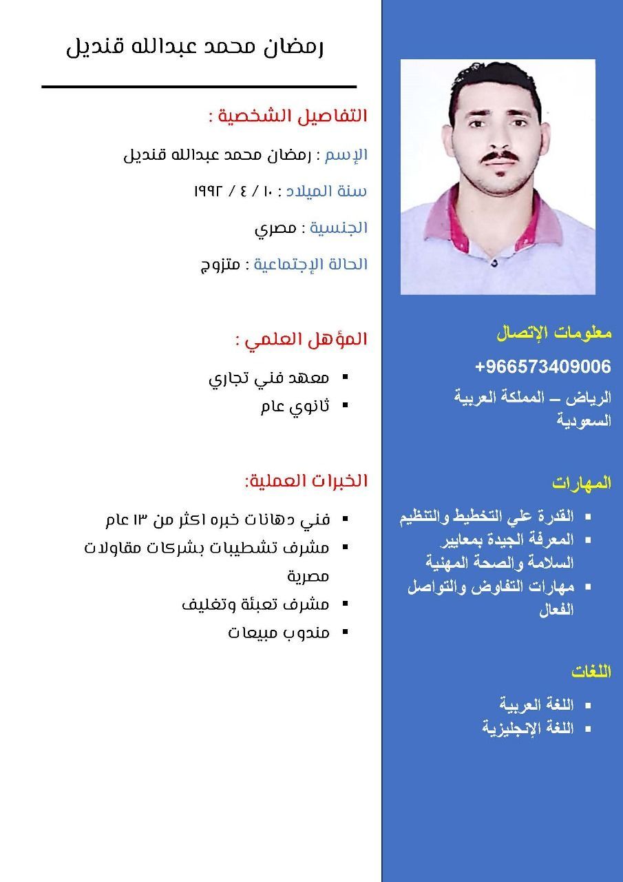 رمضان محمد عبدالله مقيم في الرياض خبرة في مجال الدهانات أكثر من 13 عام ومشرف تشطيبات في مجال الدهانات حاصل على معهد فني تجاري وثانوية عامة وسبق لي العمل في معارض دهانات وحاليا ابحث عن فرصة عمل متاحه