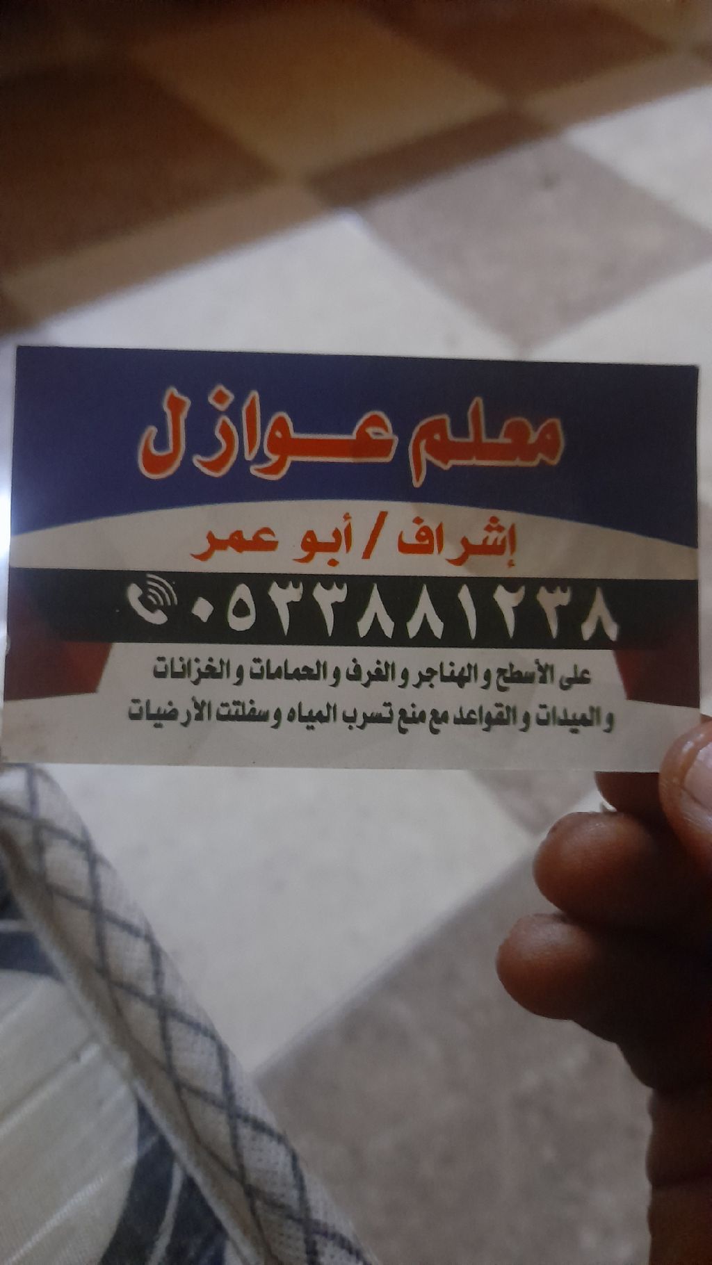 فني تركيب عوازل على الأسطح والهناقر والغرف والحمامات والمطابخ والخزانات ودهن القواعد والميدات