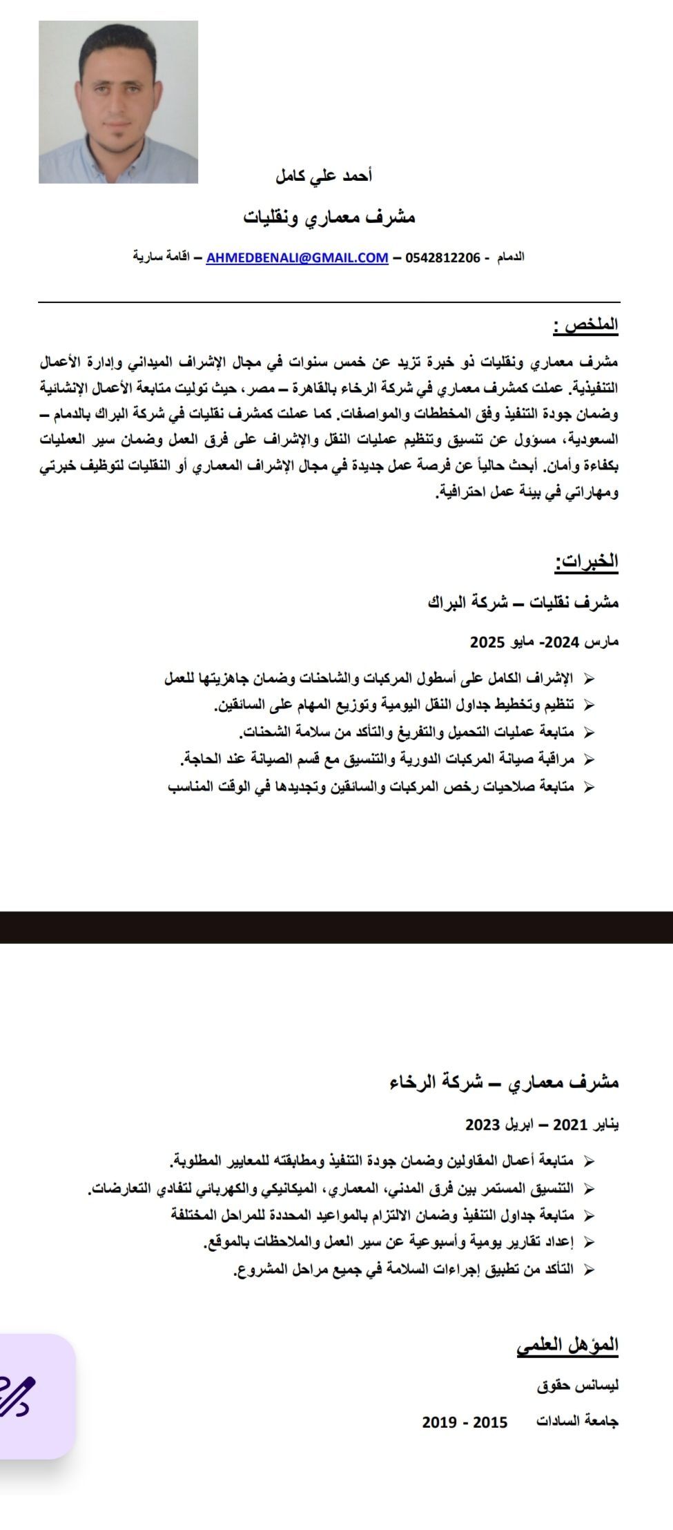 مشرف مصري متفرغ للعمل، خبرة أكثر من 5 سنوات في الاشراف المعماري وأعمال النقليات، وتنظيم المواقع، ومتابعة المقاولين وجودة التنفيذ، مع اتقان استخدام برامج المتابعة وتنسيق الأعمال واعداد التقارير التشغيلية. خبرة في السعودية ومصر وإقامة سارية