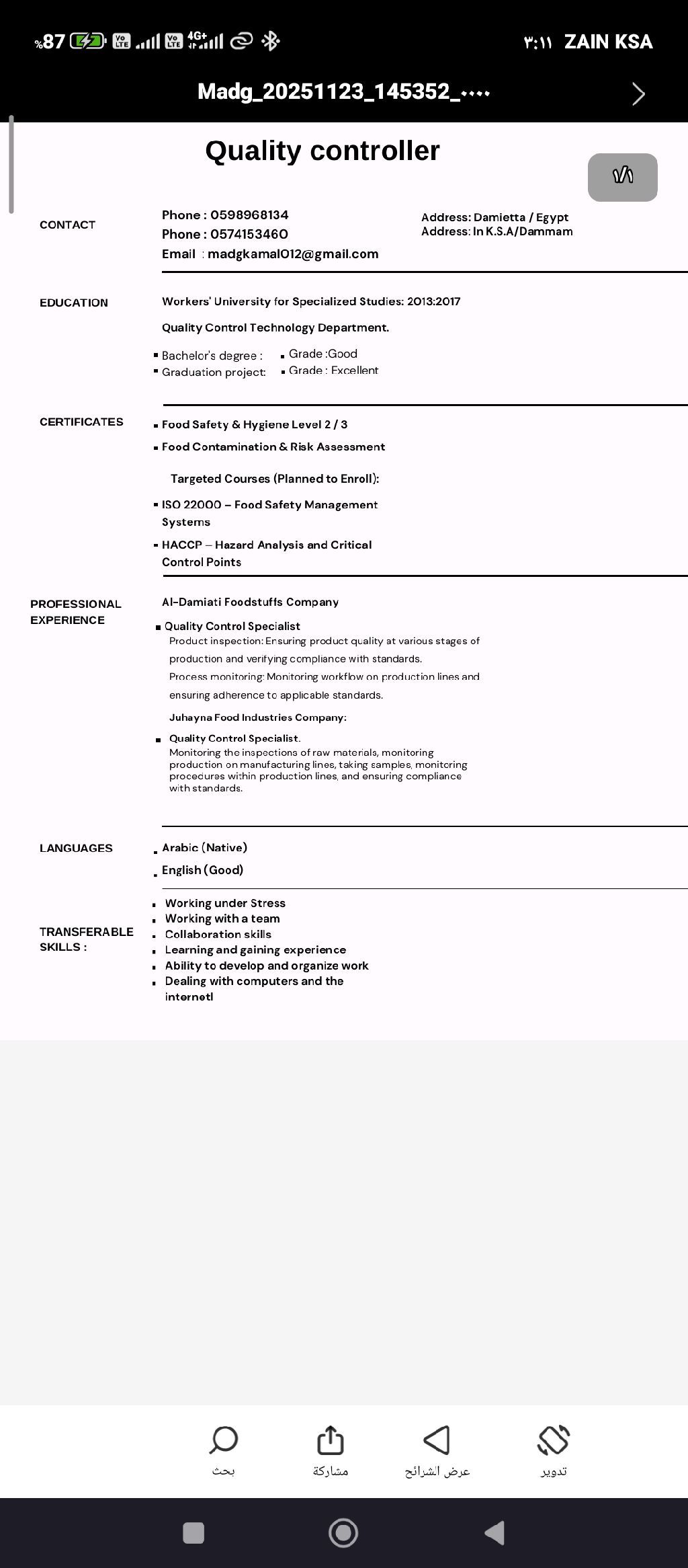 أخصائي رقابة جودة متواجد في الدمام مستعد للانتقال الى أي مكان داخل المملكة خبرة أكثر من 5 سنوات يوجد إقامة سارية ومتواجد فالمملكة لأكثر من 6 سنوات