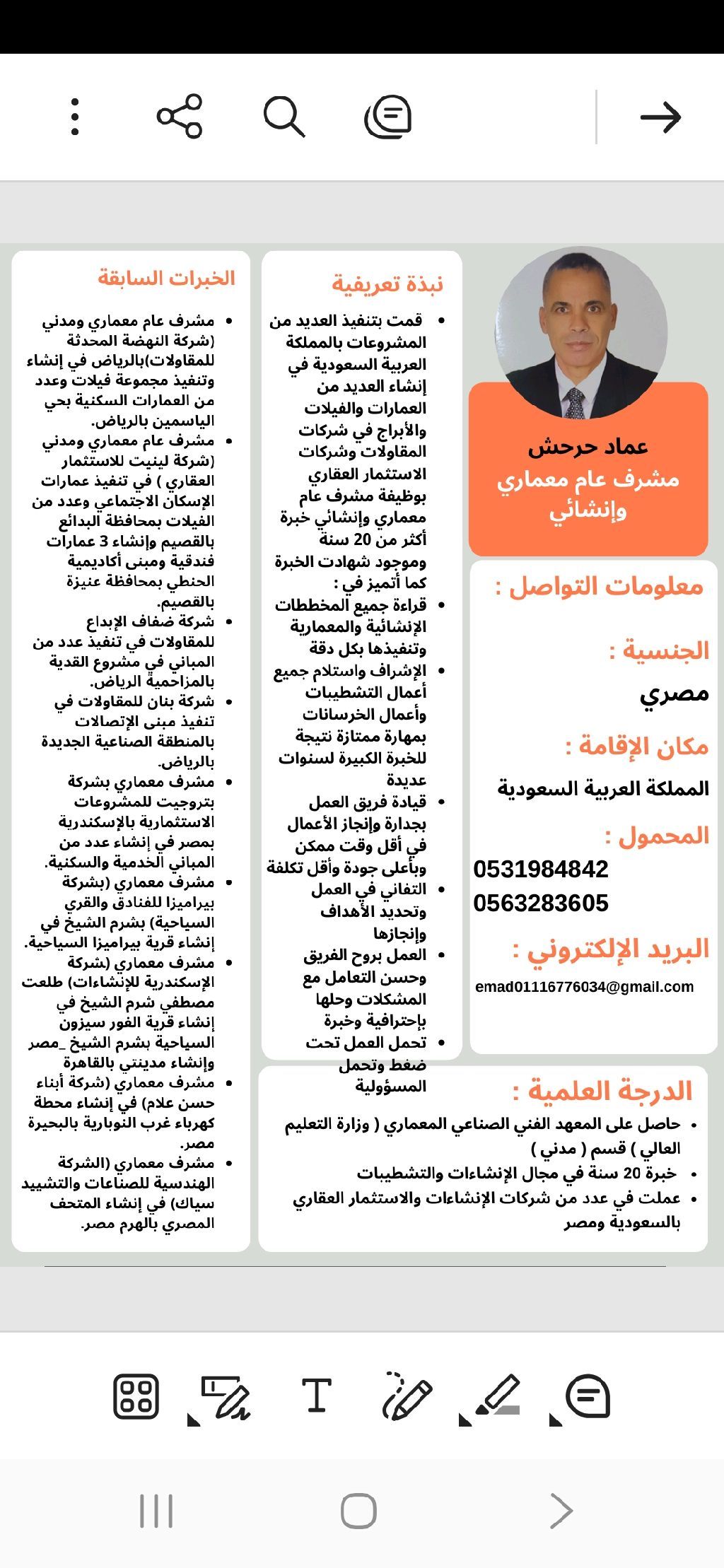 مشرف عام معماري وانشائي مصري خبرة 20 سنة في التنفيذ والاشراف واستلام جميع أعمال التشطيبات والعظم وقراءة المخططات المعمارية والانشائية وتنفيذها بأعلى جودة وأسرع وقت وأقل تكلفة وضبط سير العمل باحترافية وحساب الكميات والتكاليف والعمل على ميزان الليفل المساحي وذلك في الأبراج والفلل والعمارات والمصالح الحكوميه والمباني الصناعية بداية من الحفر حتى التسليم على المفتاح