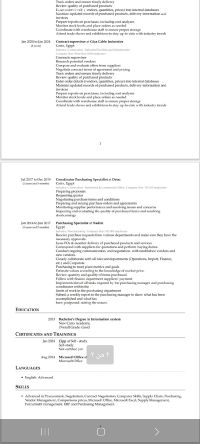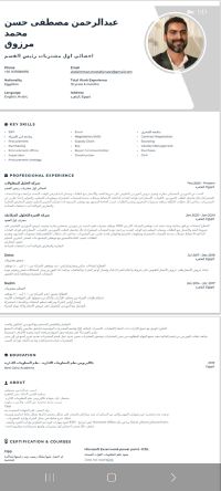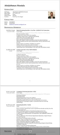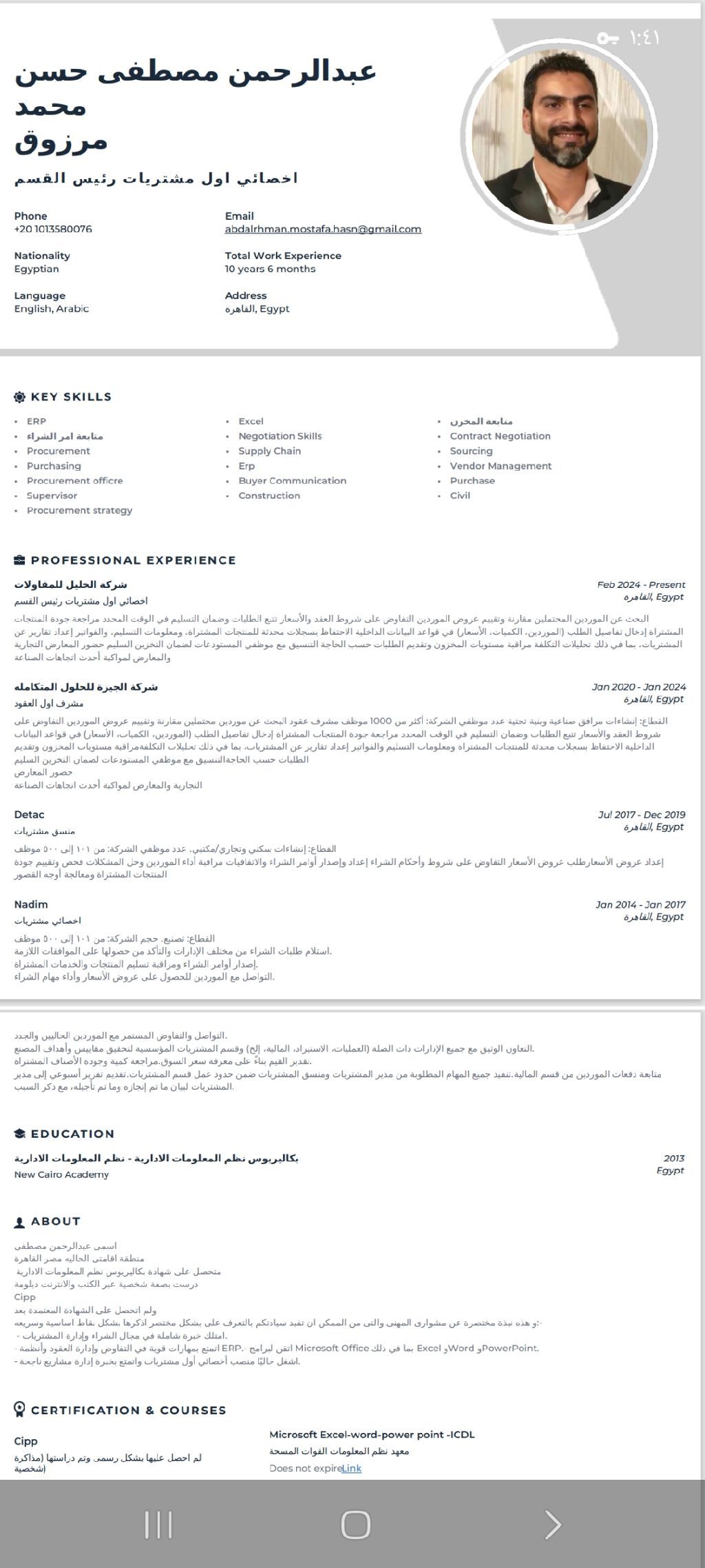 ابحث عن عمل ك مدير / مسؤول مشتريات طلب عمل بادارة المشتريات في شركات المقاولات اسمي عبدالرحمن مصطفى منطقة اقامتي الحاليه مصر القاهرة حاصل على شهادة بكاليريوس درست بصفة شخصية دبلومة Cipp نبذة مختصرة عن مشواري المهني - امتلك خبرة شاملة في مجال الشراء وإدارة المشتريات. أتمتع بمهارات قوية في التفاوض وإدارة العقود وأنظمة ERP. اشغل حاليا منصب أخصائي أول مشتريات وأتمتع بخبرة إدارة مشاريع ناجحة