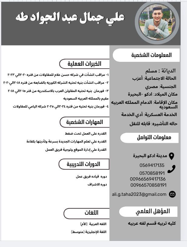 مراقب انشاء وبنية تحتية يطلب عمل خبرة 10 سنوات في النيه التحية مقم في السعودية في الدمام