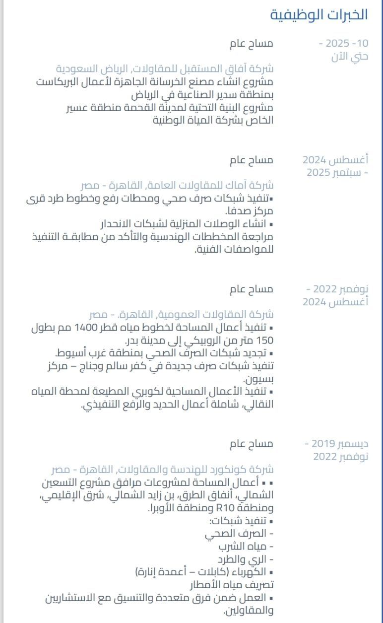 مساح عام متواجد في الرياض خبرتي في أعمال المساحة تزيد عن 6 سنوات في مشاريع المقاولات، البنية التحتية، الإنشاءات، الطرق والكباري، شبكات المياه والصرف الصحي، محطات الرفع، وخطوط الطرد المركزي