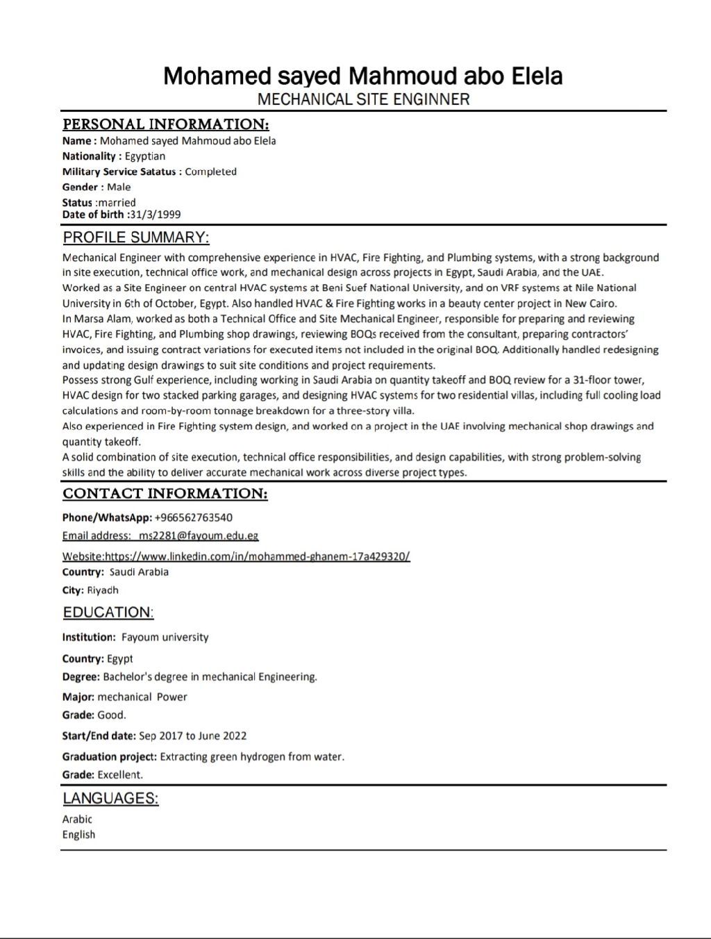 مهندس ميكانيكا خريج 22 على دراية بشغل الموقع والمكتب الفني وورقيات المشروع والتسليم والتعامل مع الاستشاري ومراجعة اللوح وعمل الشوب درونج وال As - built في نظام الحريق والتكييف والصحي. وعلى دراية بالتصميم واشتغلت تصميم لفلل في السعودية والامارات على دراية بشغل الهاب والأليت فاير. اشتغلت تكييف نظام أل chilled water وال VRF. جاهز للشغل في أي وقت ومعيا إقامة سنة متواجد في الرياض