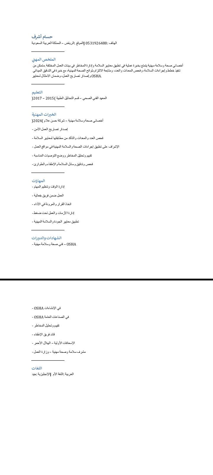 مشرف سيفتي ابحث عن فرصة عمل مناسبة متاح نقل كفالة وإقامة سارية مقيم في الرياض