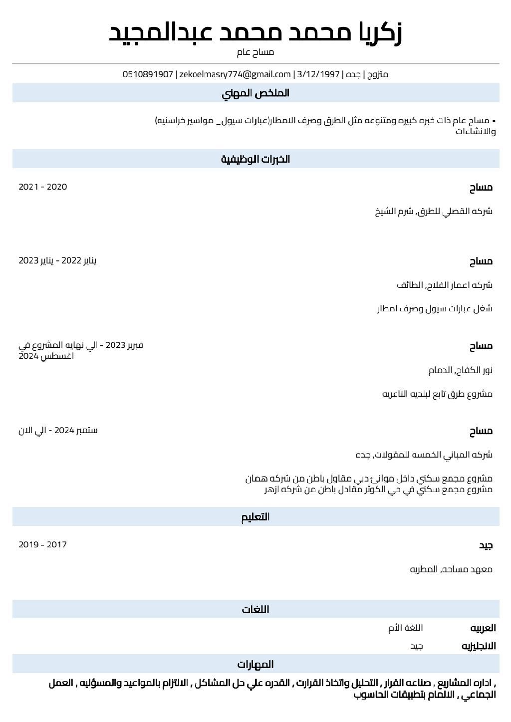 مساح عام خبرة 6 سنوات اشتغلت بنية تحتية وطرق وانشاءات مسجل في الهيئة الهندسيه ومعي رخصة قيادة جيد في استخدام البرامج الهندسيه جاهز للعمل في أي مكان في المملكة