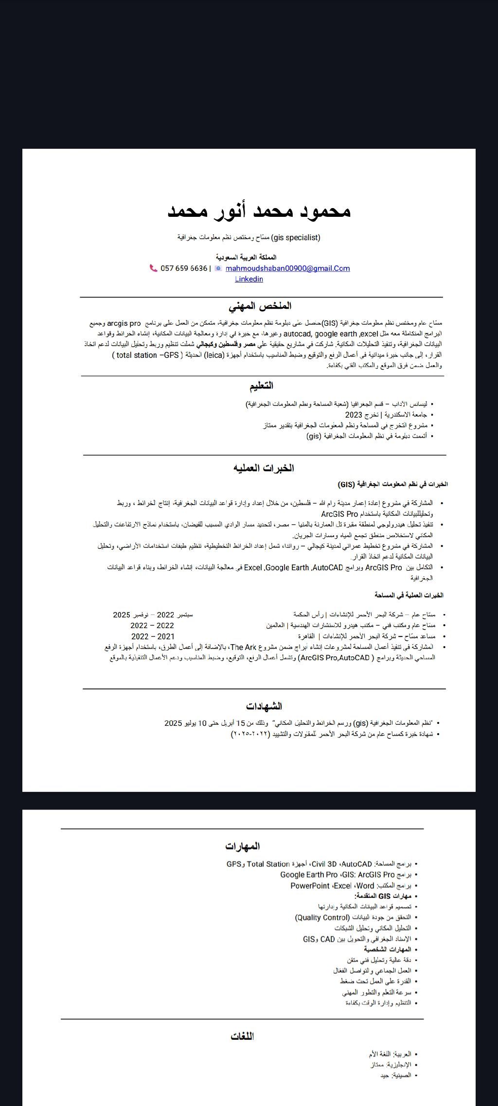 مساح عام ومتخصص نظم المعلومات الجغرافية (GIS) أعمال مساحية كاملة (رفع - توقيع - ميزان Total Station - GPS) شغل مكتب وموقع، خرائط GIS وقواعد بيانات. جاهز للعمل فورا