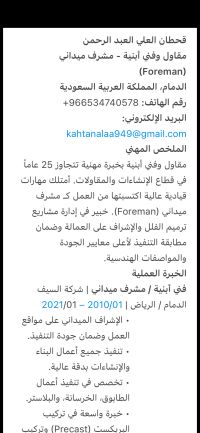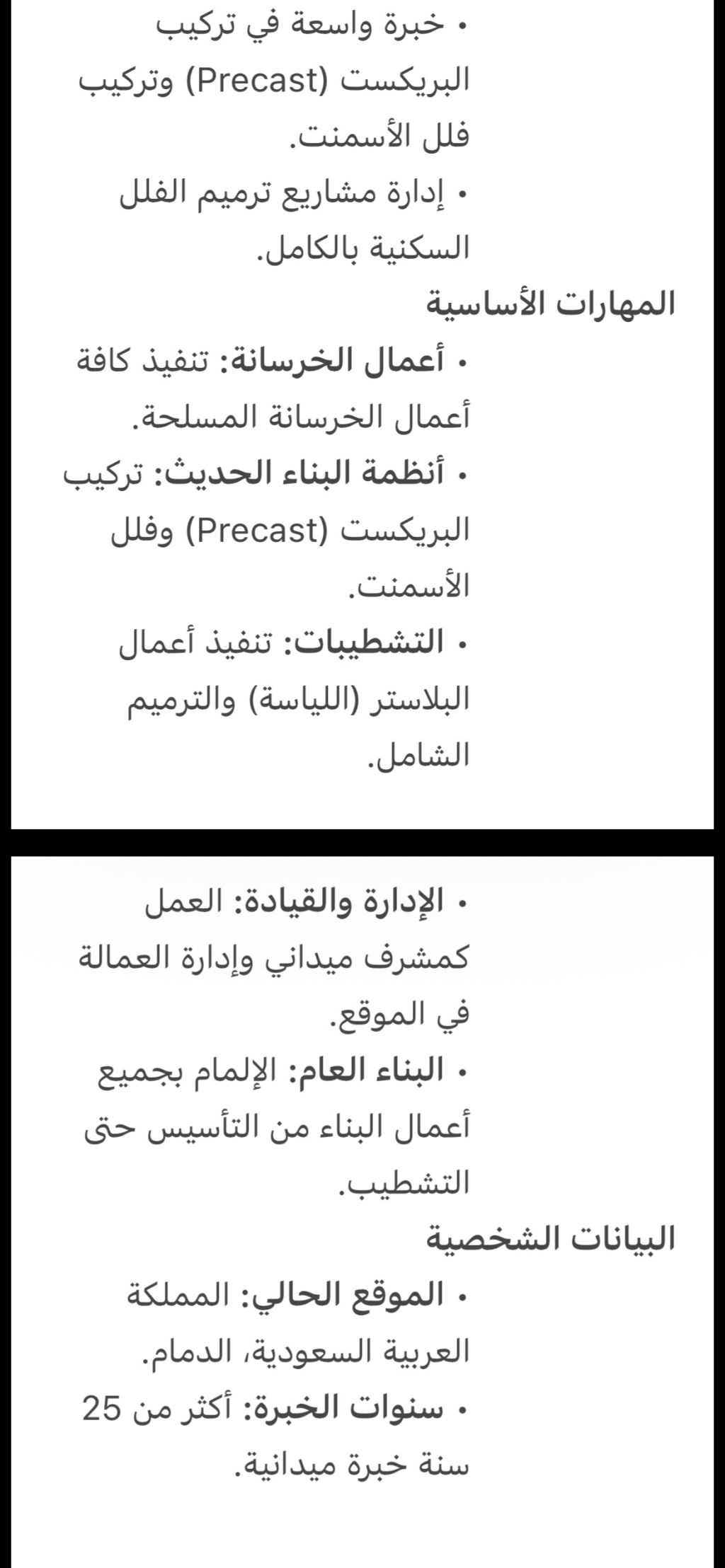 مقاول بخبرة تمتد الى 25 سنة في أعمال البناء والإنشاءات، متخصص في أعمال بناء الطابوق وتنفيذ الأعمال الخرسانية، وتركيب البريكست، وتنفيذ أعمال البلاستر. عملت كفورمان ومشرف ميداني في عدة مشاريع، ولدي خبرة واسعة في تنفيذ أعمال ترميم الفلل والاشراف على فرق العمل وضمان جودة التنفيذ وفق المعايير المطلوبة
