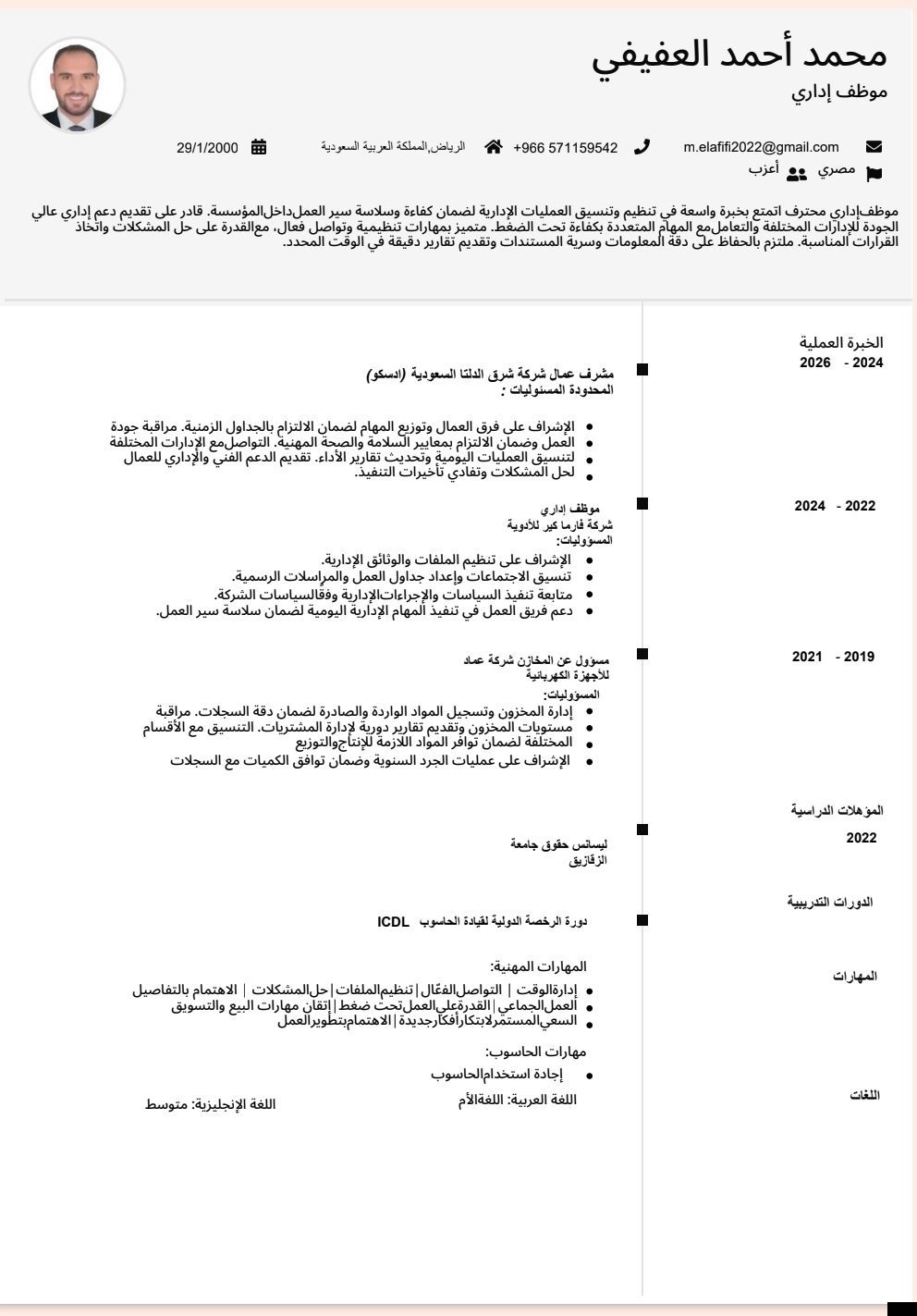 ابحث عن وظيفة مشرف عمال أنا محمد العفيفي، حاصل على ليسانس حقوق، العمر 26 عاما، متواجد في الرياض المملكة العربية السعودية منذ عام ونصف. عملت في مكتب خدمات عامة لمدة ستة أشهر، كما عملت مشرفا في شركة مقاولات لمدة عام. متواجد في الرياض ومستعد للعمل في أي مكان داخل المملكة العربية السعودية، وابحث عن فرصة عمل في وظيفة ادارية أو وظيفة مشرف. مرفق السيرة الذاتية للاطلاع، وجاهز للتواصل في حال توفر