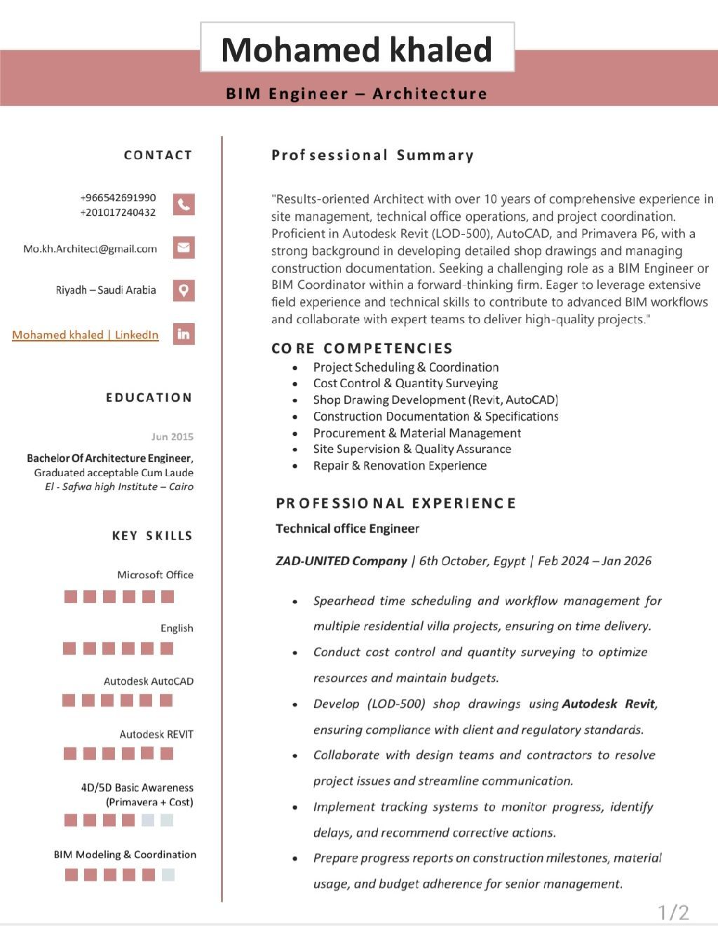 Architect with 10 + years in site management & technical office. Skilled in Revit (LOD - 500) AutoCAD & Primavera P6. Based in Riyadh, seeking a BIM Engineer role to utilize my field experience in accurate modeling & project coordination. Eager to join a BIM - driven team