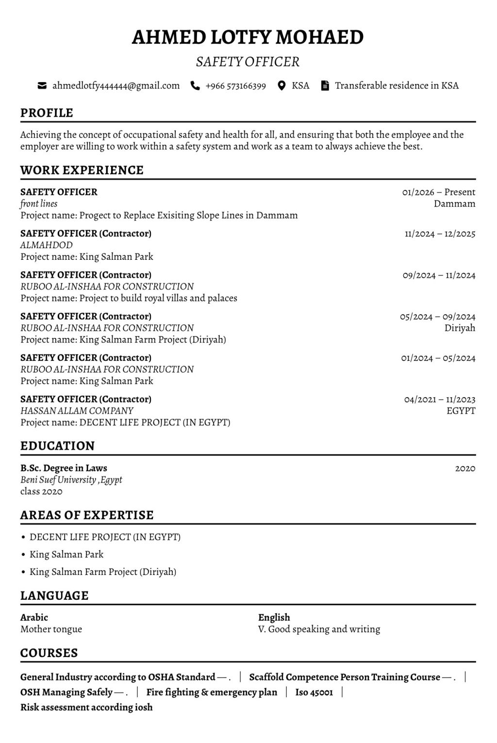 مشرف صحة وسلامه مهنية (safety officer) خبرة خمس سنوات حاصل علي شهادات الايوش واوشا جينرال واوشا سقالات واوشا صناعات ومكافحة الحريق والأيزو 45001 وتقييم المخاطر إقامة سارية ومستعد لنقل كفالة أن وجد ومستعد للتنقل داخل السعودية