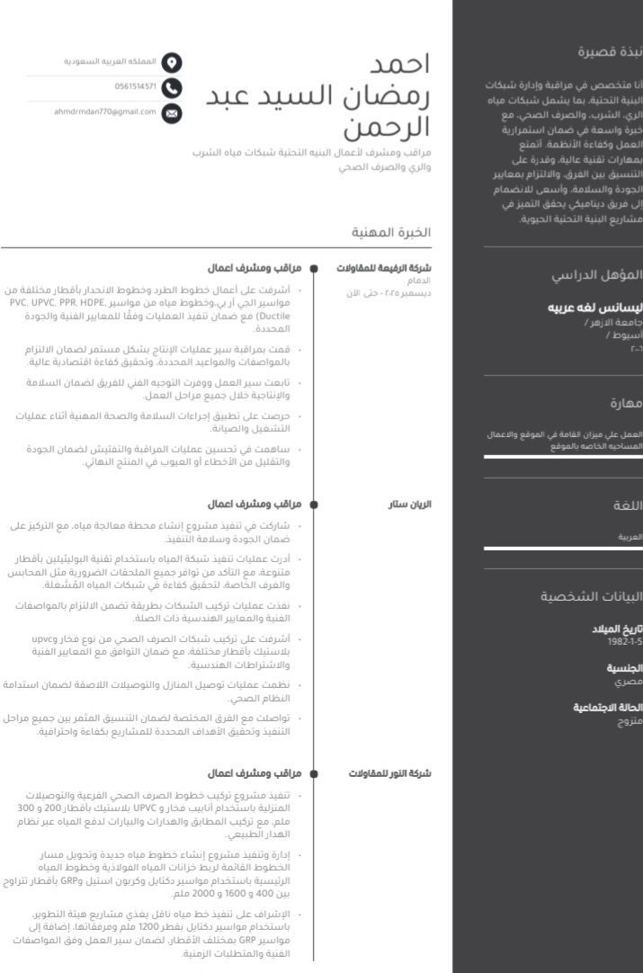 مراقب ومشرف البنيه التحتية شبكات الري ومياه الشرب والصرف الصحي خبرة أكثر من 10 أعوام