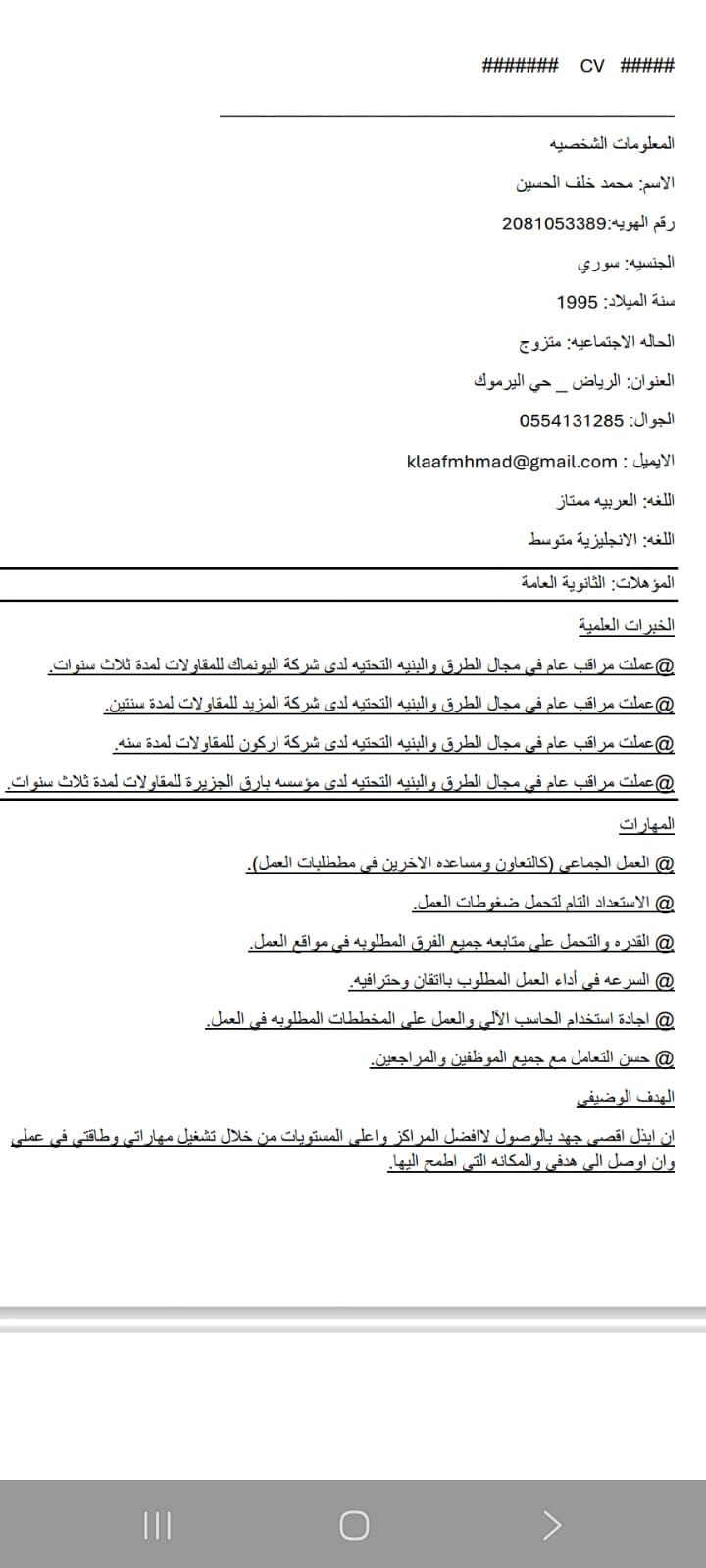 مراقب عام خبرة أكثر من 8 سنوات في مجال الطرق والبنيه التحتية والانشاءات والتشطيبات للتواصل