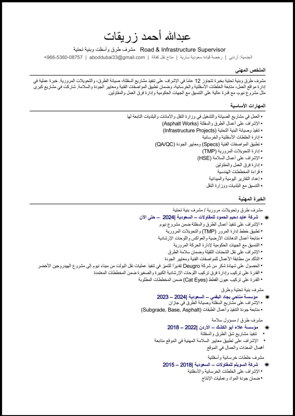 مشرف اسفلت اداري وتشغيلي مشاريع الصيانة والبنيه تحتية وزارة النقل والبلديات والامانة شخصيه قوية ميدانيه والانجاز في الميدان هو أكبر اثبات لدي القدرة على ادارة فرق الاسفلت عمل اللوحات الارشادية الكبيرة والصغيرة وانشاءها عمل فرق دهانات الطرق والتخطيط لها وأعمال أخرى يتم ذكرها بالمقابله ويتم تطبيقها في أرض الميدان المتابعة مع الاستشاريين وانجاز كامل متطلباتهم وتوقيع المستخلصات ومتابعتها