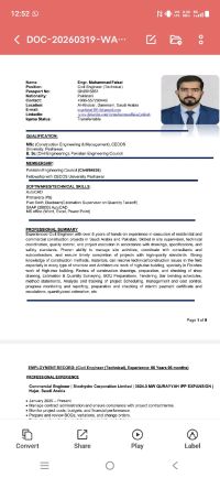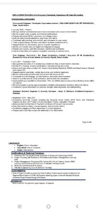 أنا مهندس مدني متاح للعمل في المملكة العربية السعودية، وأسعى حاليا للحصول على فرصة وظيفية في أحد المجالات التالية مهندس مدني فني، مهندس موقع، مهندس ضبط الجودة (QA / QC) أو مهندس كميات (QS) امتلك خبرة عملية ميدانية في مشاريع البناء والبنية التحتية، تشمل أعمال الخرسانة والهياكل المعدنية، بالاضافة الى تنفيذ الأعمال في الموقع وأنشطة الفحص والتفتيش. أحمل درجة الماجستير في إدارة التشييد (MSc Construct