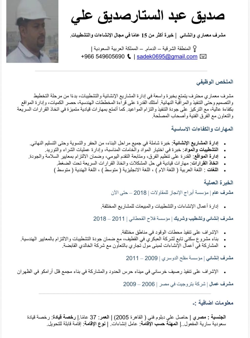 مشرف عام خبرة حوالي 18 عام في المقاولات وموجود رخصة سعوديه