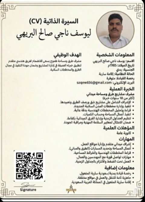 أنا يمني ابحث عن عمل أشرف في الطرق وجسور ومخططات سكنيه خبرة من عام 2005م وأحمل رخصة قيادة واشتغل في أي عمل عندي خبرات كثيرة فاهم جميع الاجهزة المساحية والتصاميم ومتابعة العمل عندي شهادة خبرة بعد الثانوية