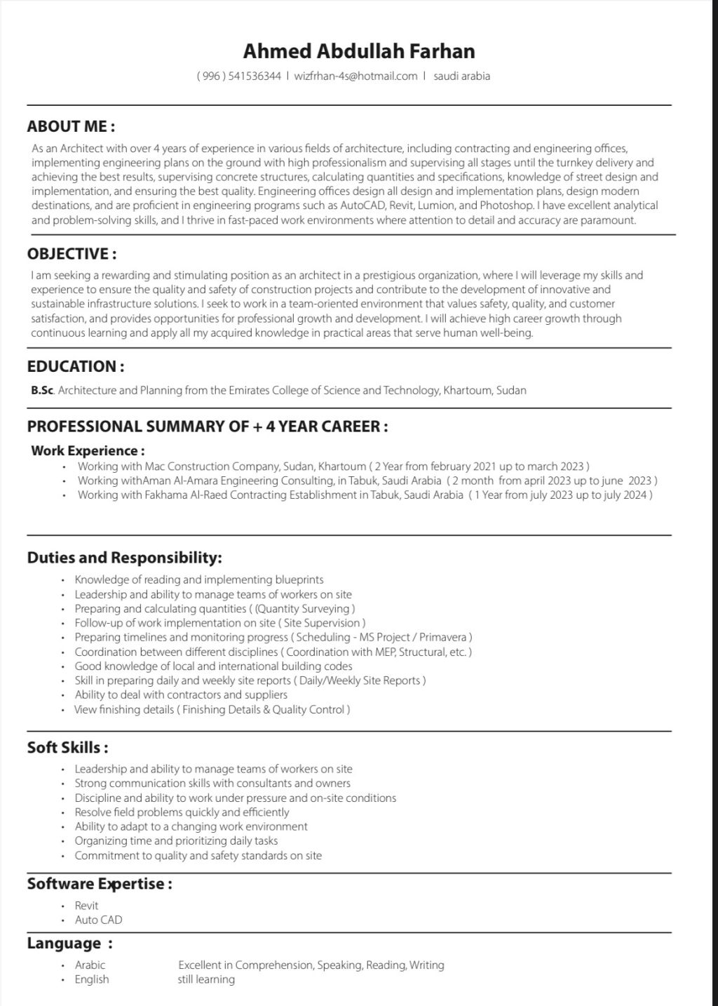مهندس معماري متخصص في التشطيبات وأعمال الموقع أتمتع بخبرة عملية قوية في متابعة مراحل التنفيذ وضبط الجودة وتسليم المشاريع بكفاءة متقن لبرامج Revit وAutoCAD في اعداد وتنفيذ المخططات المعمارية ابحث عن فرصة ميدانية أسهم فيها بإدارة فنية فعالة وتحقيق أعلى مستوى من التشطيب الاحترافي. جاهز للعمل فورا