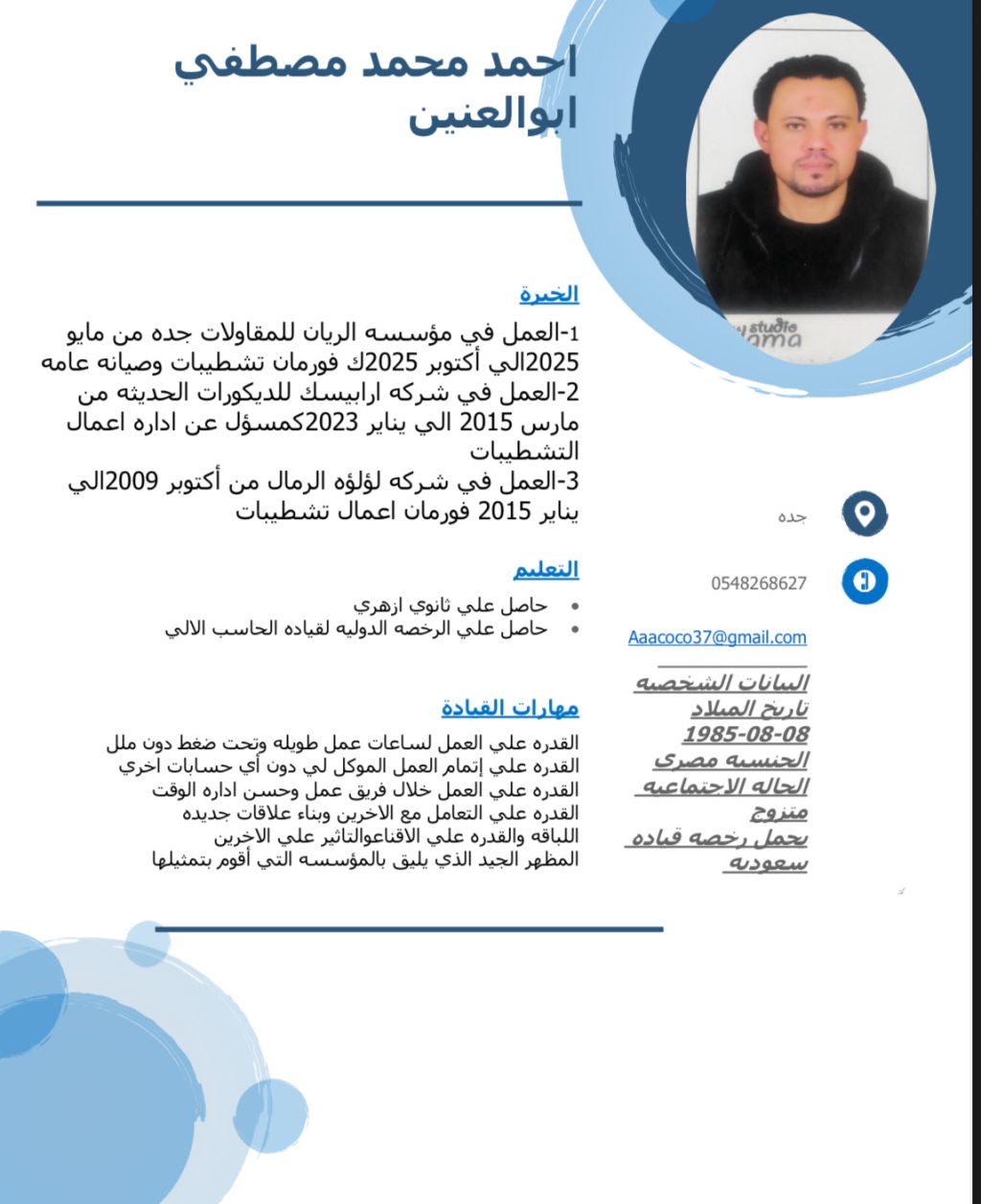 ابحث عن عمل ك فورمان ومراقب عام ومشرف موقع خبرة لأكثر من 15 عام في أعمال التشطيب ومتابعه العمل والعمال وحساب كميات ومندوب مشتريات