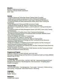 مهندس ميكانيكي خبرة أربع سنوات مع درجة البكالوريوس وخبرة متنوعة في إدارة المشاريع والعمليات والصيانة في قطاعات التصنيع ومعالجة الأغذية في وظيفة مهندس تشغيل وصيانة في شركتي مروج وقباء فوود. أثبتت القدرة على قيادة المشاريع الى الانتهاء بنجاح كمهندس مشاريع في المنظمة السودانية الدولية للتنمية وحقوق الانسان. عدة دورات تدريبية في مراقبة الجودة، وإدارة المخاطر، والسلامة، وإدارة المشاريع وMEP