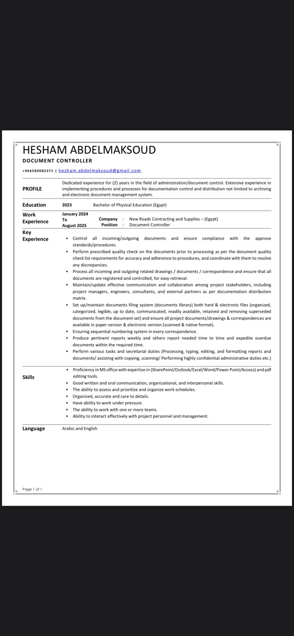أنا ابحث عن وظيفة document controller الرجاء التواصل معي لكي أستطيع ارسال أل CV الخاص بي أنا أستطيع استخدام aconex جيدا