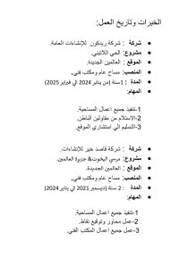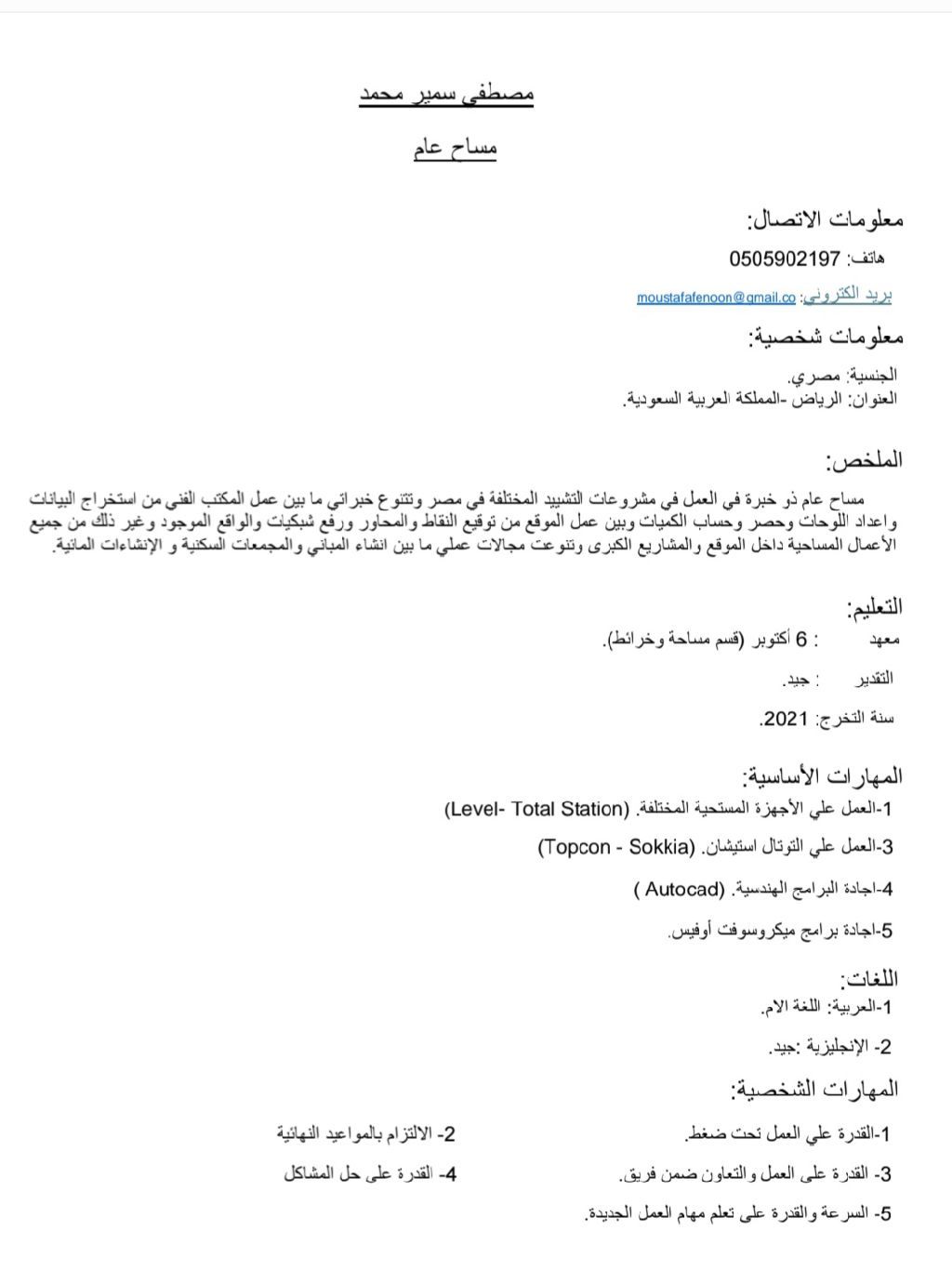 مساح عام خبرة 4 سنوات في أعمال الموقع والمكتب الفني سبق العمل في الأحياء السكنيه والأعمال الانشائية والتشطيبات وأعمال البنية التحتية وأعمال اللاند سكيب وأعمال الطرق وأعمال المنشاءات المعدنية واجادة أعمال المكتب الفني والحصورات واستخدام البرامج الهندسيه (AutoCAD & civil) وايجادة برامج الأوفيس (excel - word) والعمل علي اجهزة المساحة بأنواعها (total station & level)